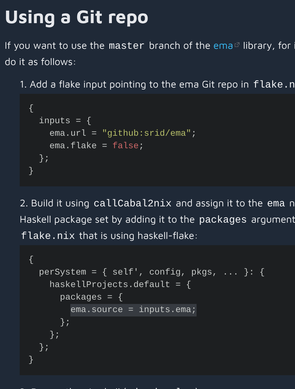 I tried setting it up via flake input, but that fails due to a broken test in the dependency flake input atomic-css. Yikes!